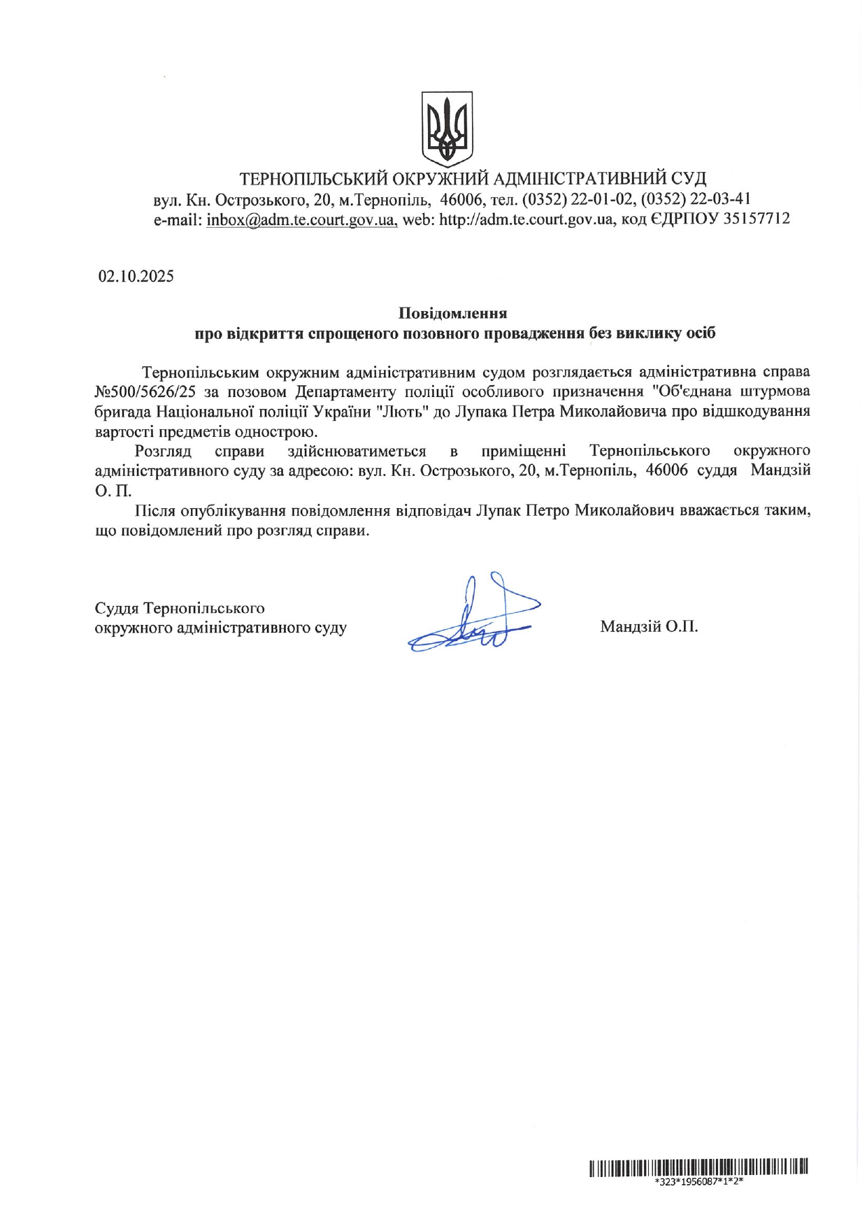 Повідомлення відповідачу Лупаку Петру Миколайовичу у справі №500/5626/25 про відкриття спрощеного позовного провадження без виклику учасників справи