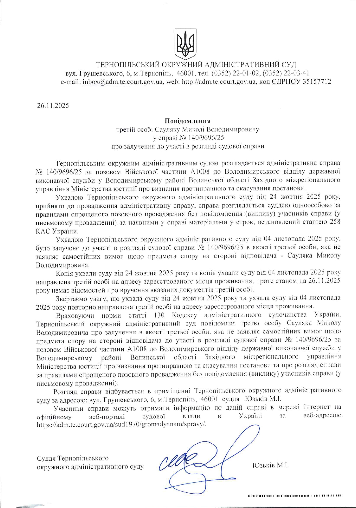Повідомлення третій особі Сауляку Миколі Володимировичу у справі №140/9696/25 про залучення до участі в розгляді судової справи