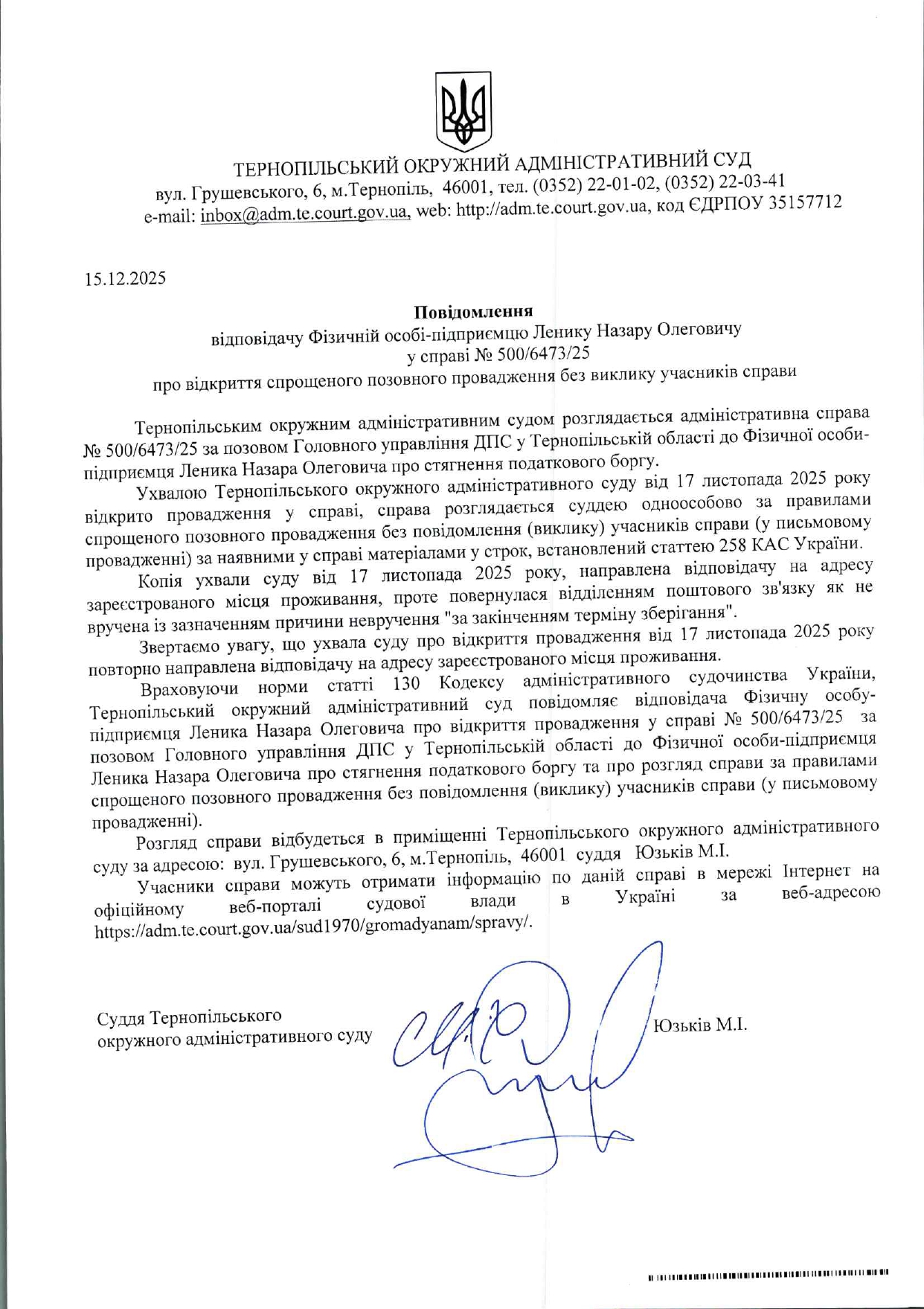 Повідомлення відповідачу фізичній особі-підприємцю Ленику Назару Олеговичу у справі №500/6473/25 про відкриття спрощеного позовного провадження без виклику учасників справи