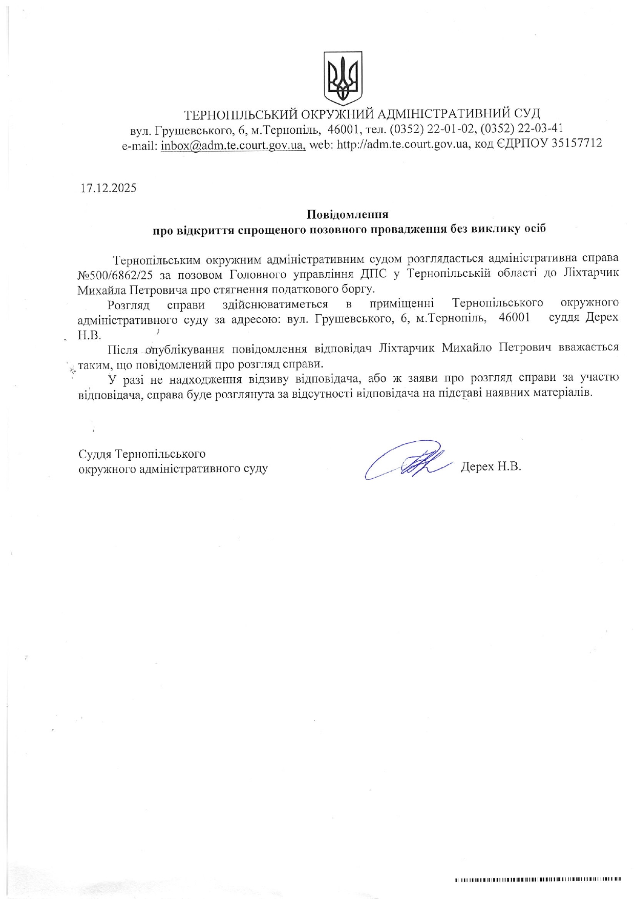 Повідомлення відповідачу Ліхтарчик Михайлу Петровичу у справі №500/6862/25 про відкриття спрощеного позовного провадження без виклику учасників справи