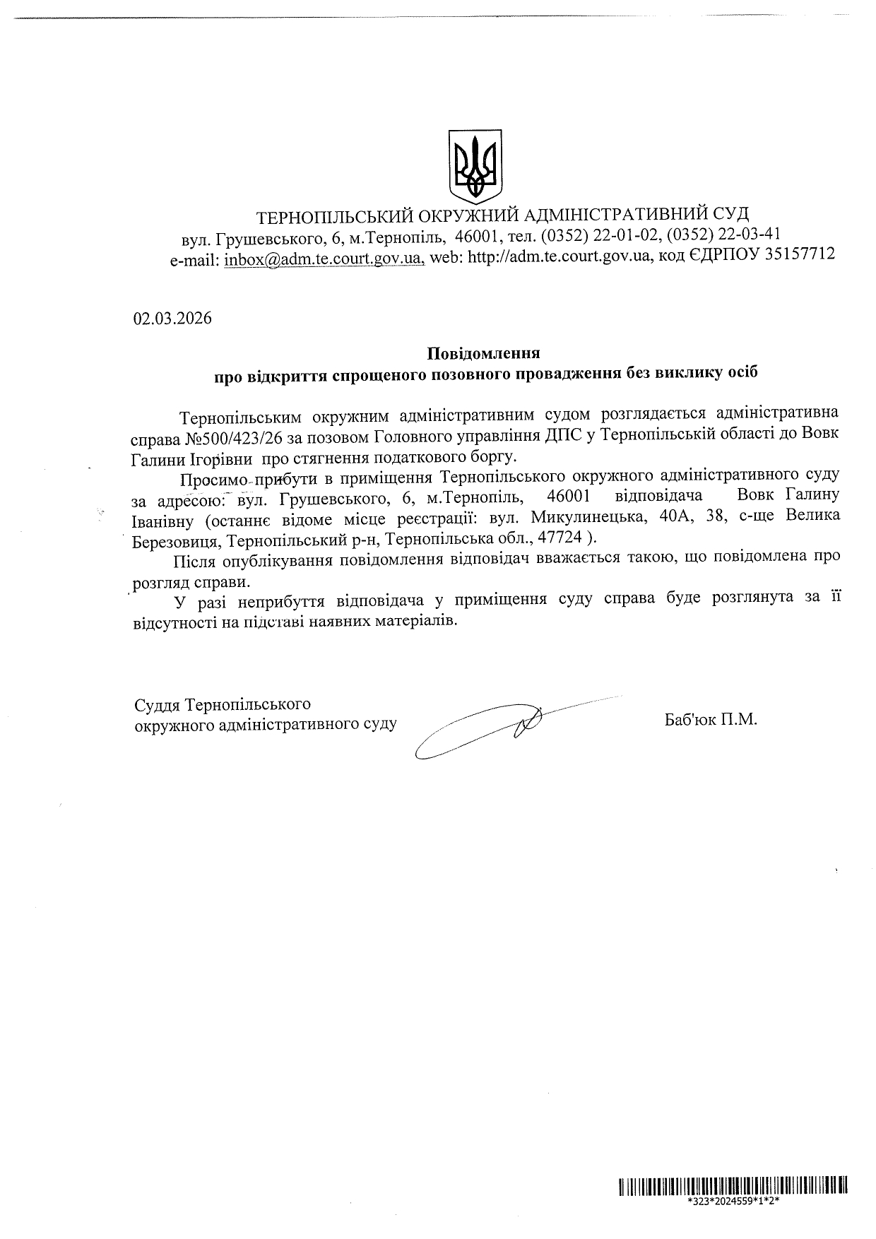 Повідомлення відповідачу Вовк Галині Ігорівні у справі №500/423/26 про відкриття спрощеного позовного провадження без виклику учасників справи