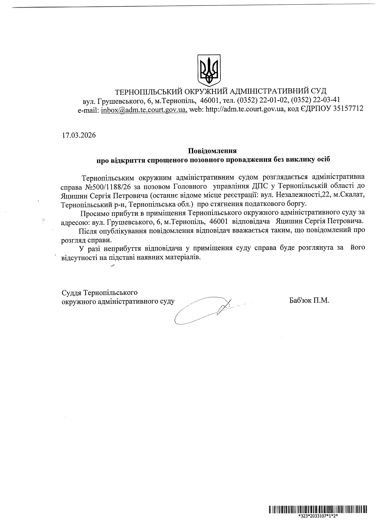Повідомлення відповідачу Яцишину Сергію Петровичу у справі №500/1188/26 про відкриття спрощеного позовного провадження без виклику учасників справи