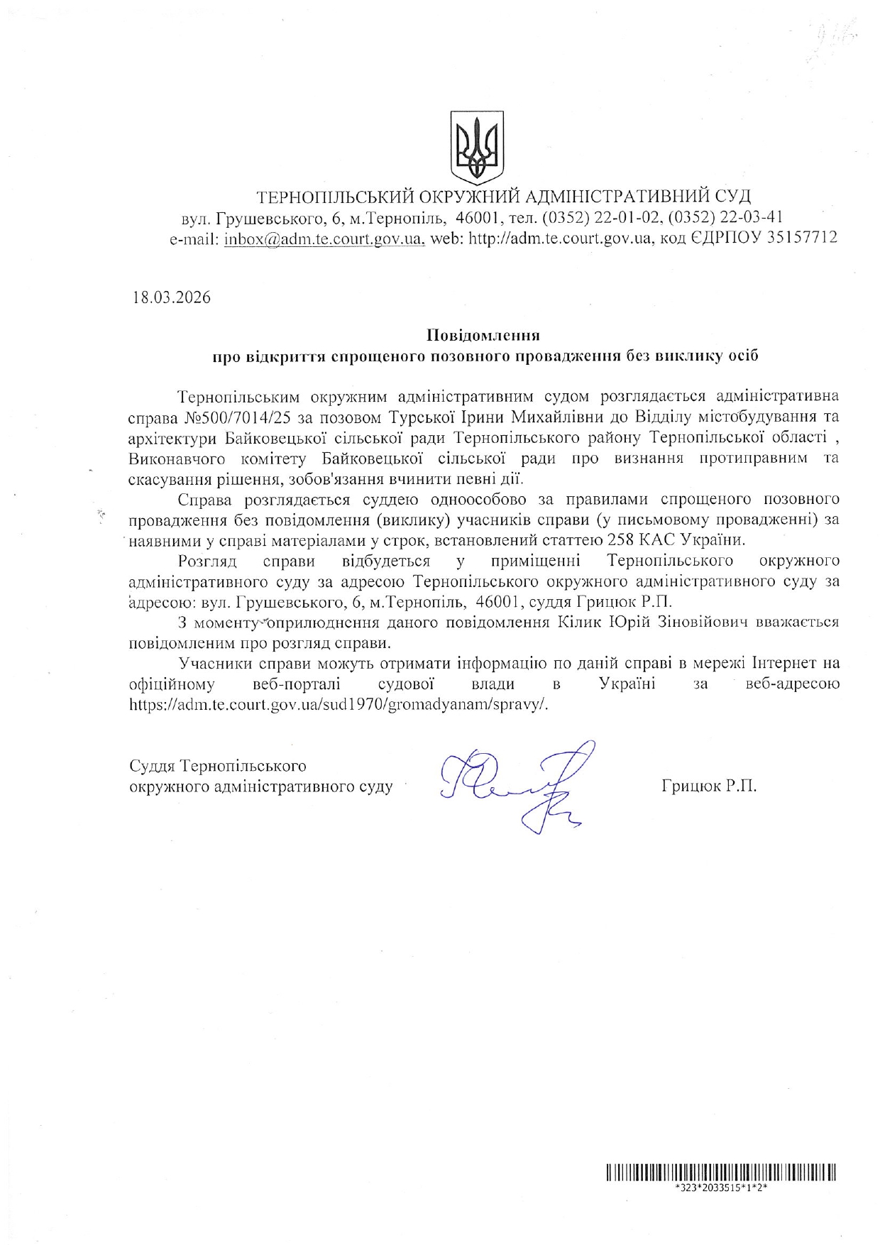 Повідомлення Кілику Юрію Зіновійовичу у справі №500/7014/25 про відкриття спрощеного позовного провадження без виклику учасників справи