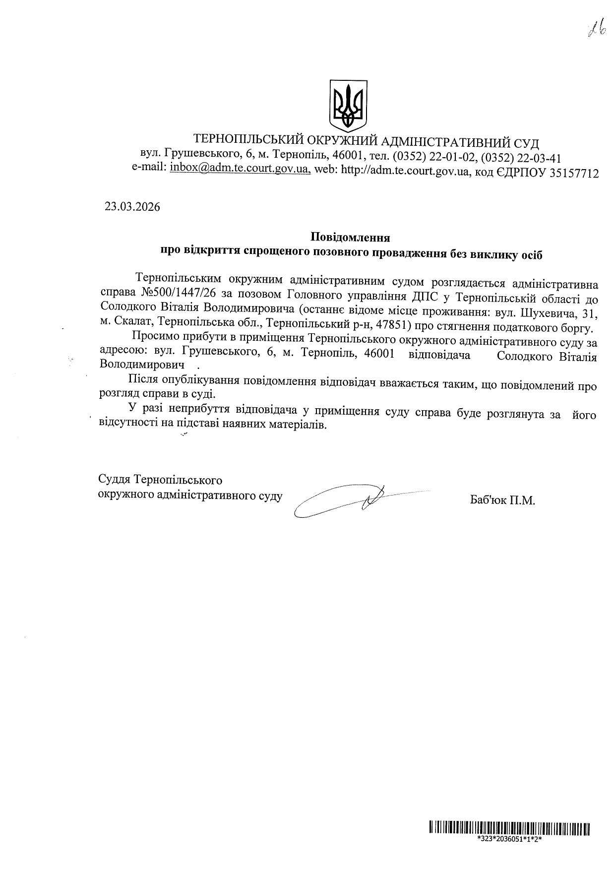 Повідомлення відповідачу Cолодкому Віталію Володимировичу у справі №500/1447/26 про відкриття спрощеного позовного провадження без виклику учасників справи