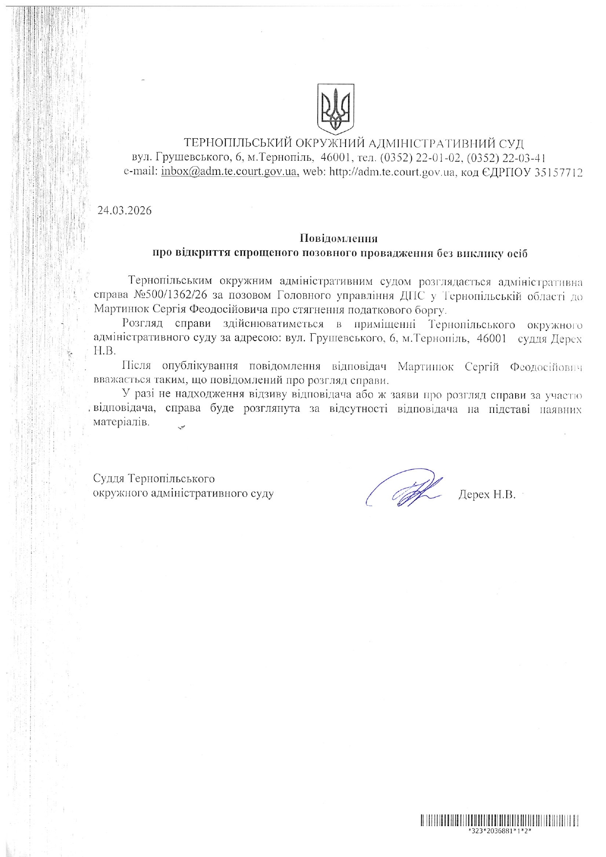 Повідомлення відповідачу Мартинюку Сергію Феодосійовичу у справі №500/1362/26 про відкриття спрощеного позовного провадження без виклику учасників справи