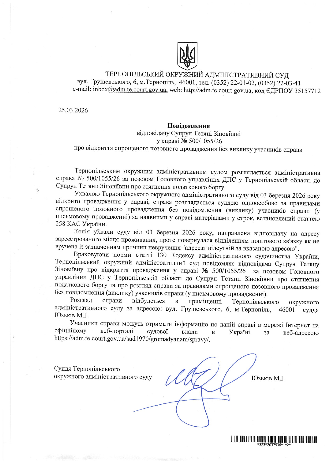 Повідомлення відповідачу Супрун Тетяні Зіновіївні у справі №500/1055/26 про відкриття спрощеного позовного провадження без виклику учасників справи
