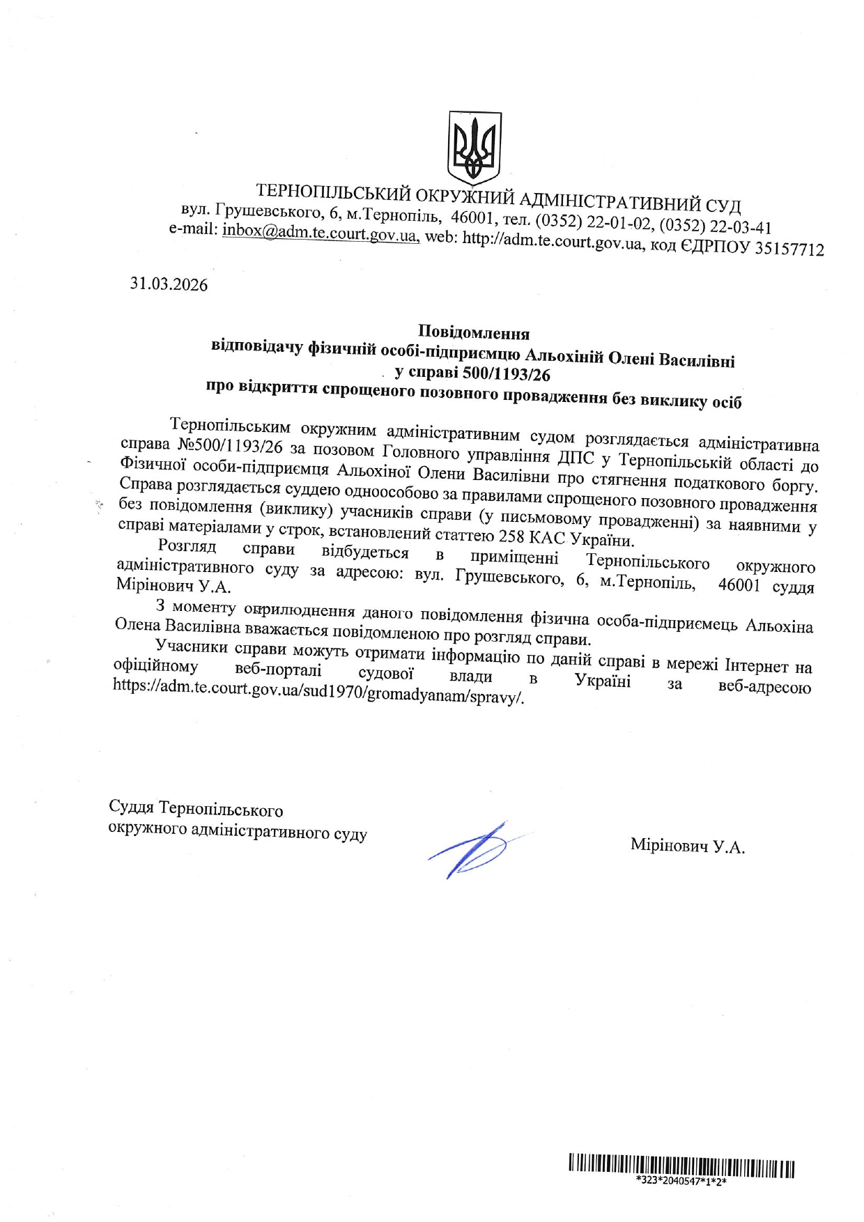Повідомлення відповідачу фізичній-особі-підприємцю Альохіній Олені Василівні у справі №500/1193/26 про відкриття спрощеного позовного провадження без виклику учасників справи