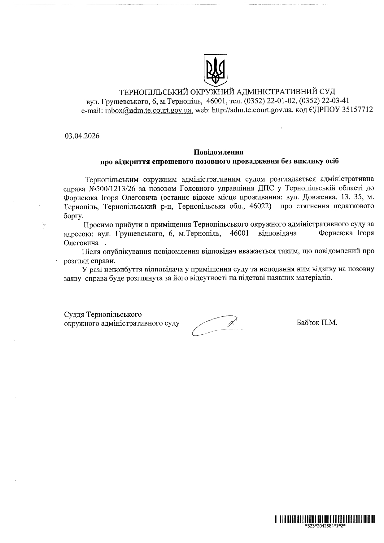 Повідомлення відповідачу Форесюку Ігорю Олеговичу у справі №500/1213/26 про відкриття спрощеного позовного провадження без виклику учасників справи