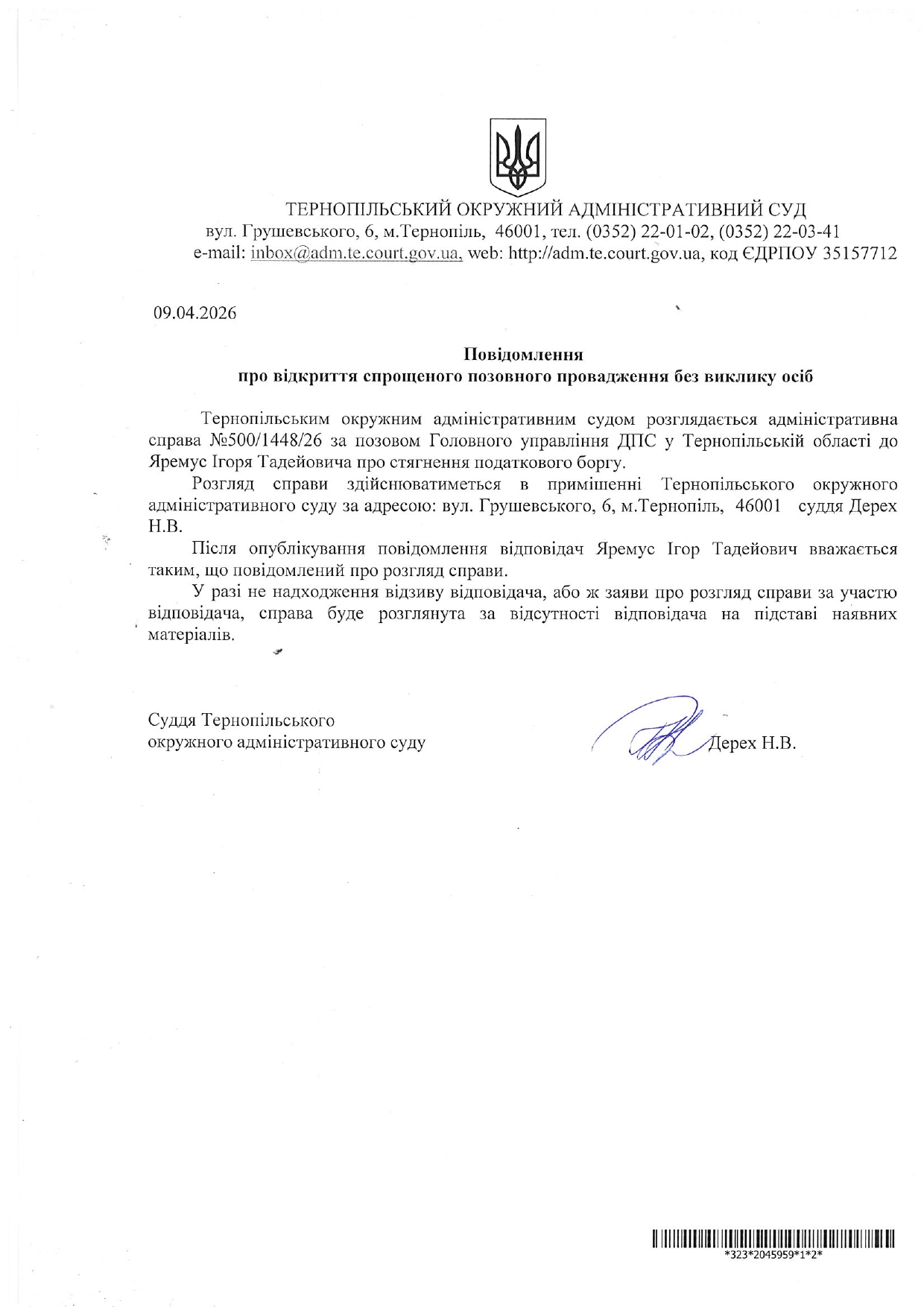 Повідомлення відповідачу Яремусу Ігорю Тадейовичу у справі №500/1448/26 про відкриття спрощеного позовного провадження без виклику учасників справи