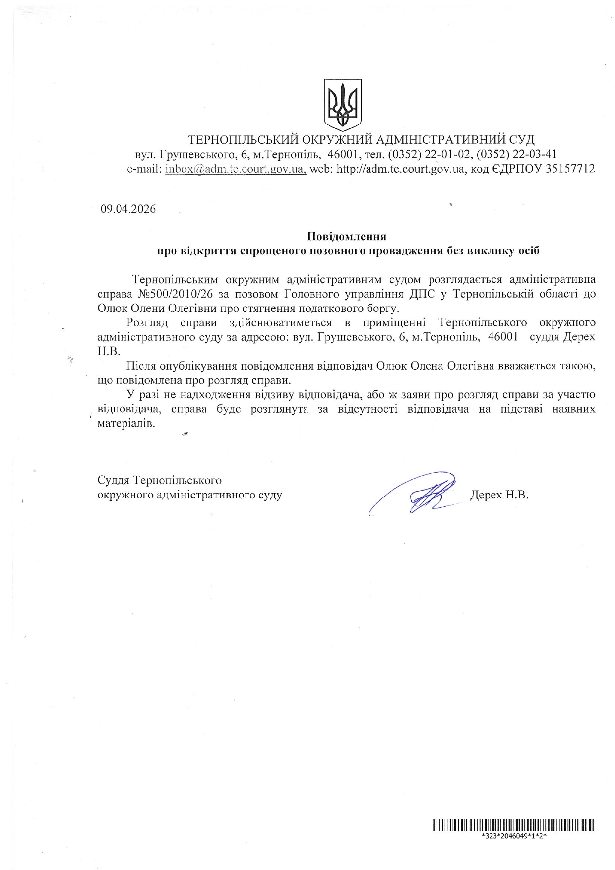 Повідомлення відповідачу Олюк Олені Олегівні у справі №500/2010/26 про відкриття спрощеного позовного провадження без виклику учасників справи