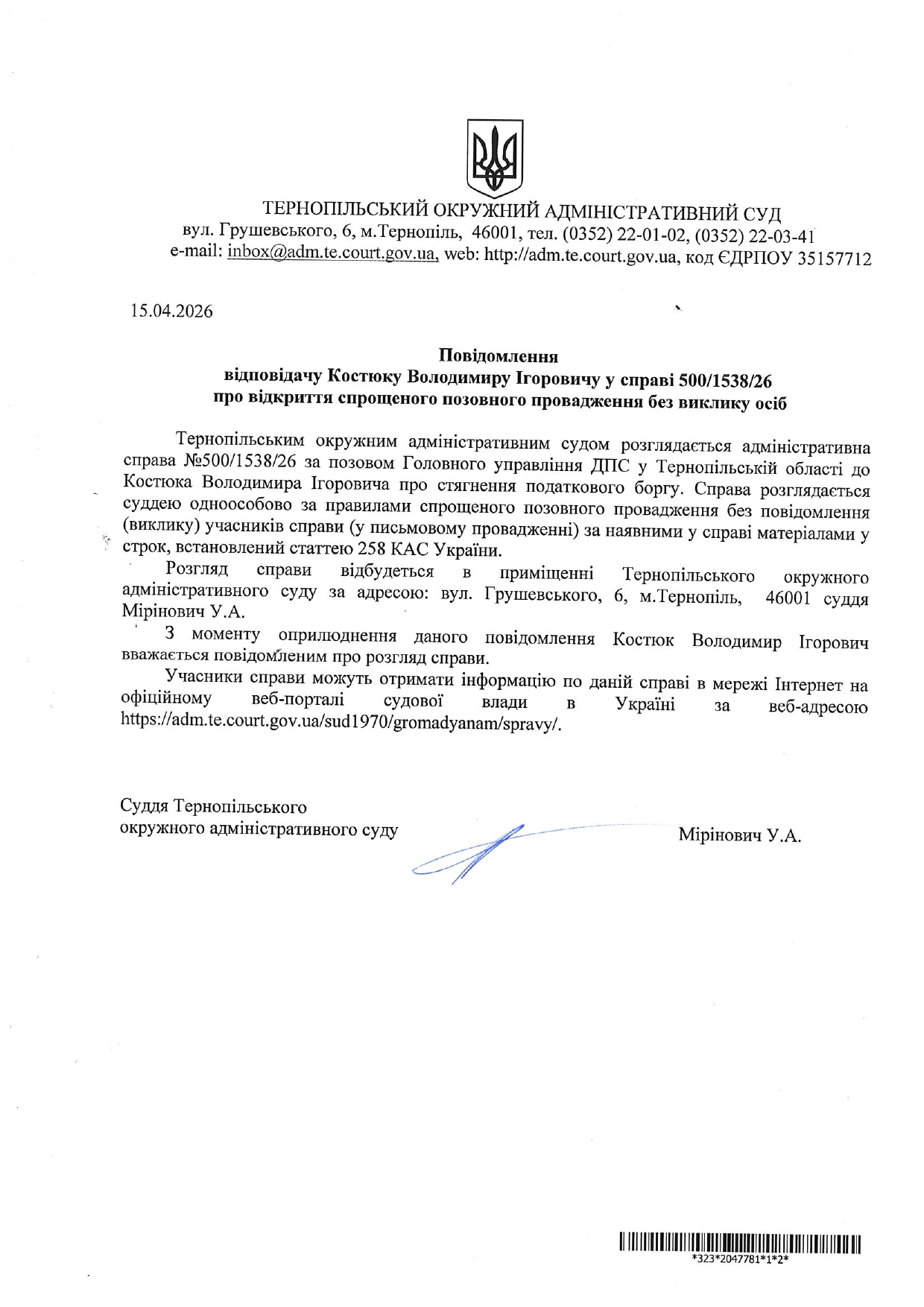 Повідомлення відповідачу Костюку Володимиру Ігоровичу у справі №500/1538/26 про відкриття спрощеного позовного провадження без виклику учасників справи