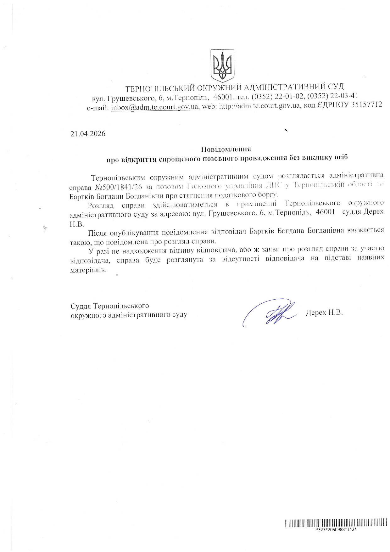 Повідомлення відповідачу Бартків Богдані Богданівні у справі №500/1841/26 про відкриття спрощеного позовного провадження без виклику учасників справи