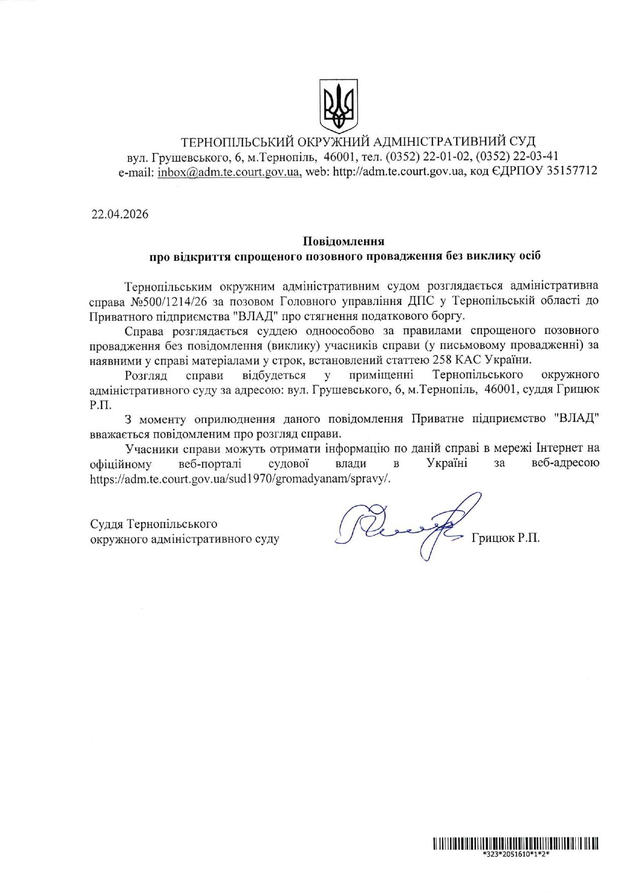 Повідомлення відповідачу ПП "ВЛАД" у справі №500/1214/26 про відкриття спрощеного позовного провадження без виклику учасників справи