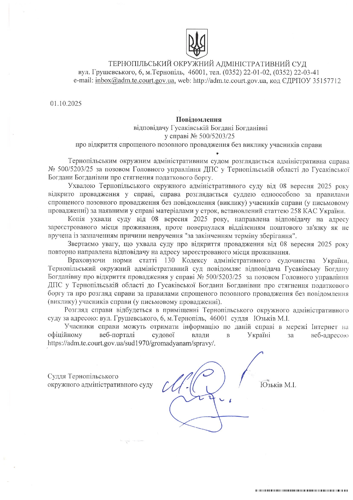 Повідомлення відповідачу Гусаківській Богдані Богданівні у справі №500/5203/25 про відкриття спрощеного позовного провадження без виклику учасників справи
