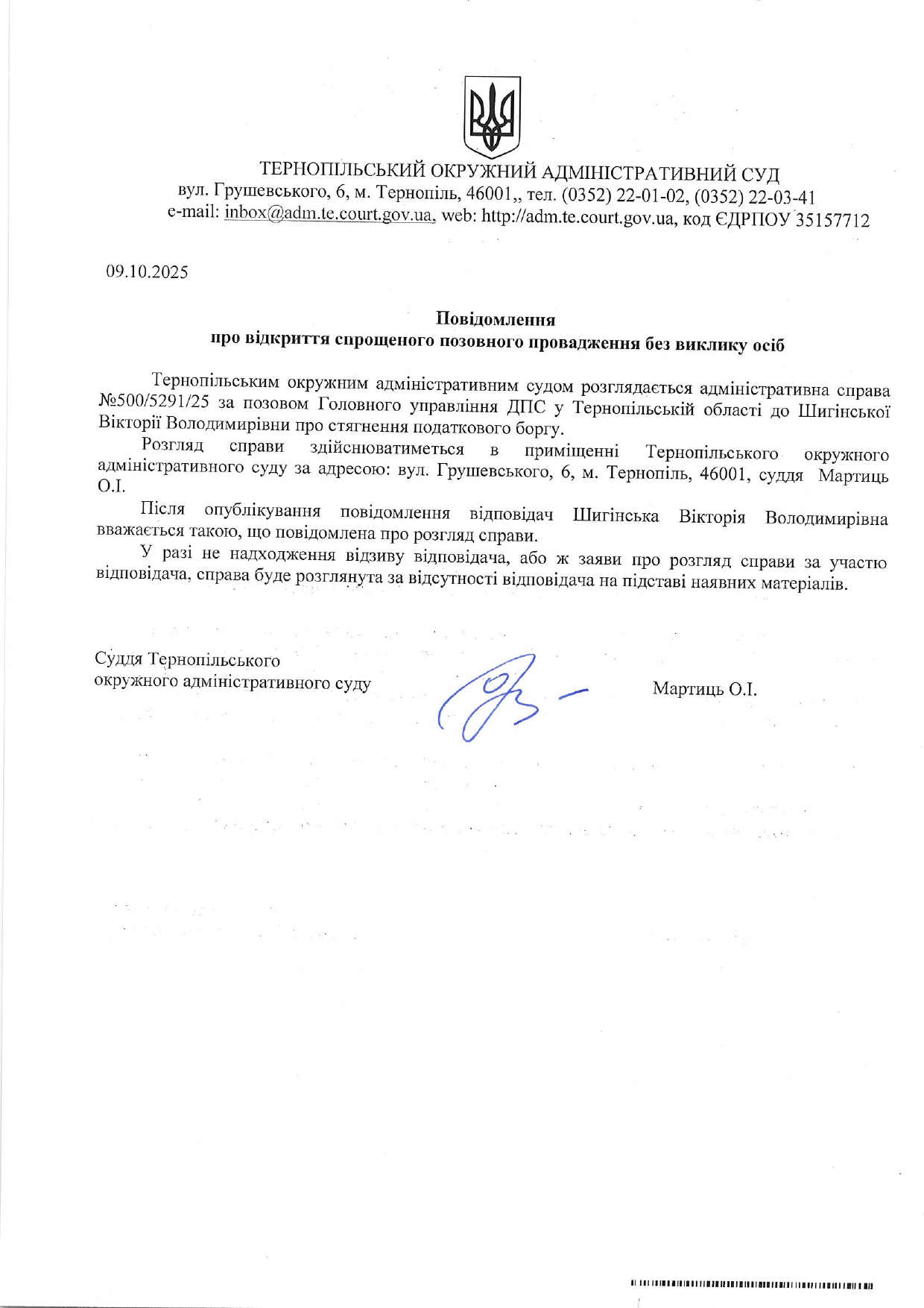 Повідомлення відповідачу Шигінській Вікторії Володимирівні у справі №500/5291/25 про відкриття спрощеного позовного провадження без виклику учасників справи