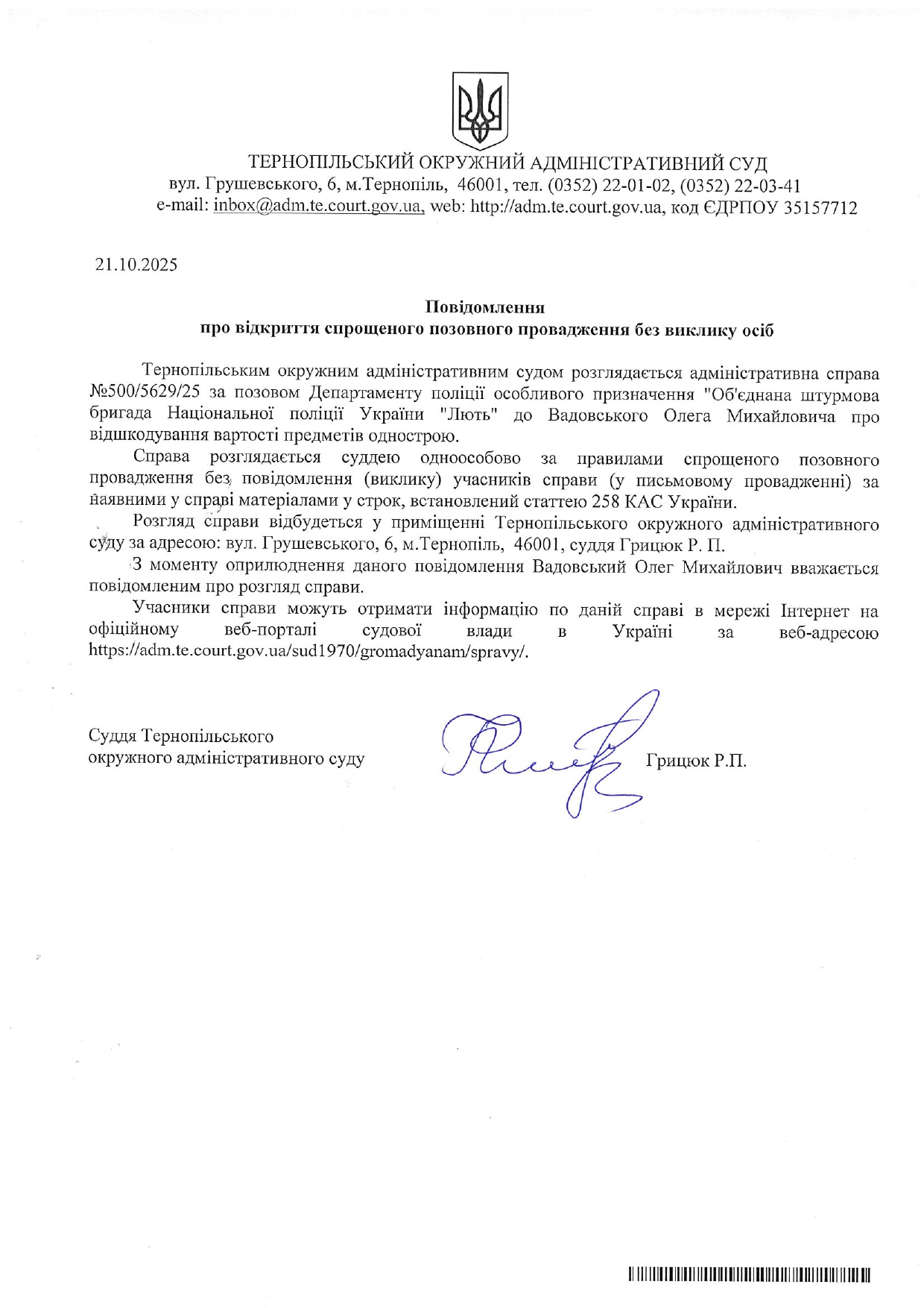 Повідомлення відповідачу Вадовському Олегу Михайловичу у справі №500/5629/25 про відкриття спрощеного позовного провадження без виклику учасників справи