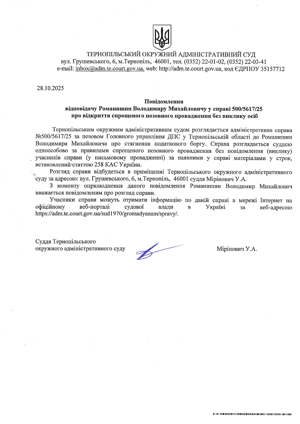 Повідомлення відповідачу Романишин Володимиру Михайловичу у справі №500/5617/25 про відкриття спрощеного позовного провадження без виклику учасників справи