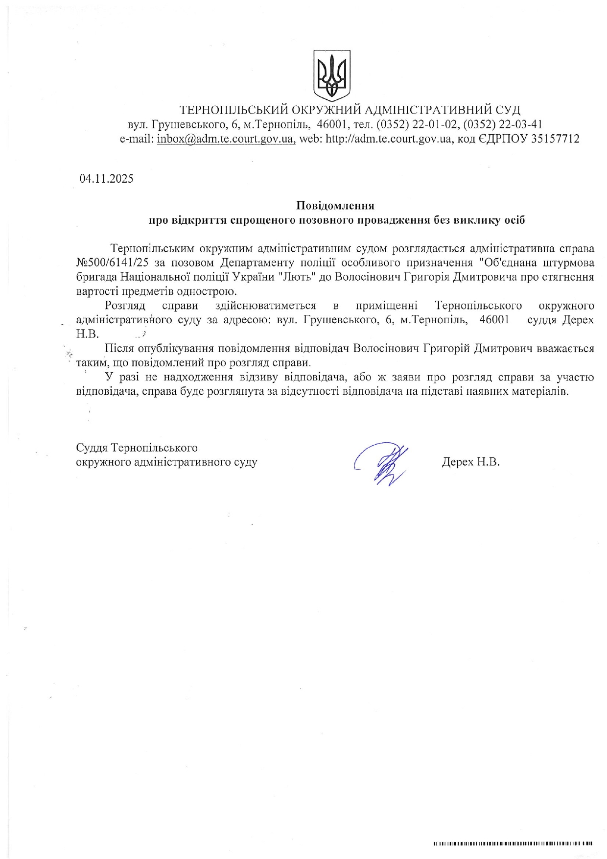 Повідомлення відповідачу Волосіновичу Григорію Дмитровичу у справі №500/6141/25 про відкриття спрощеного позовного провадження без виклику учасників справи