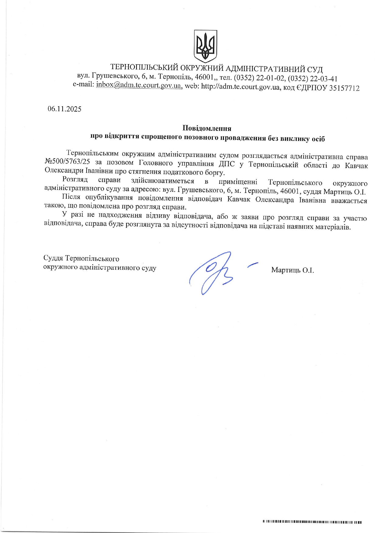 Повідомлення відповідачу Кавчак Олександрі Іванівні у справі №500/5763/25 про відкриття спрощеного позовного провадження без виклику учасників справи
