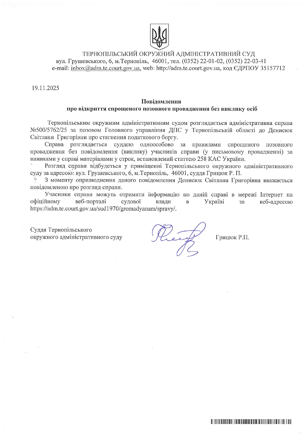 Повідомлення відповідачу Денисюк Світлані Григорівні у справі №500/5762/25 про відкриття спрощеного позовного провадження без виклику учасників справи