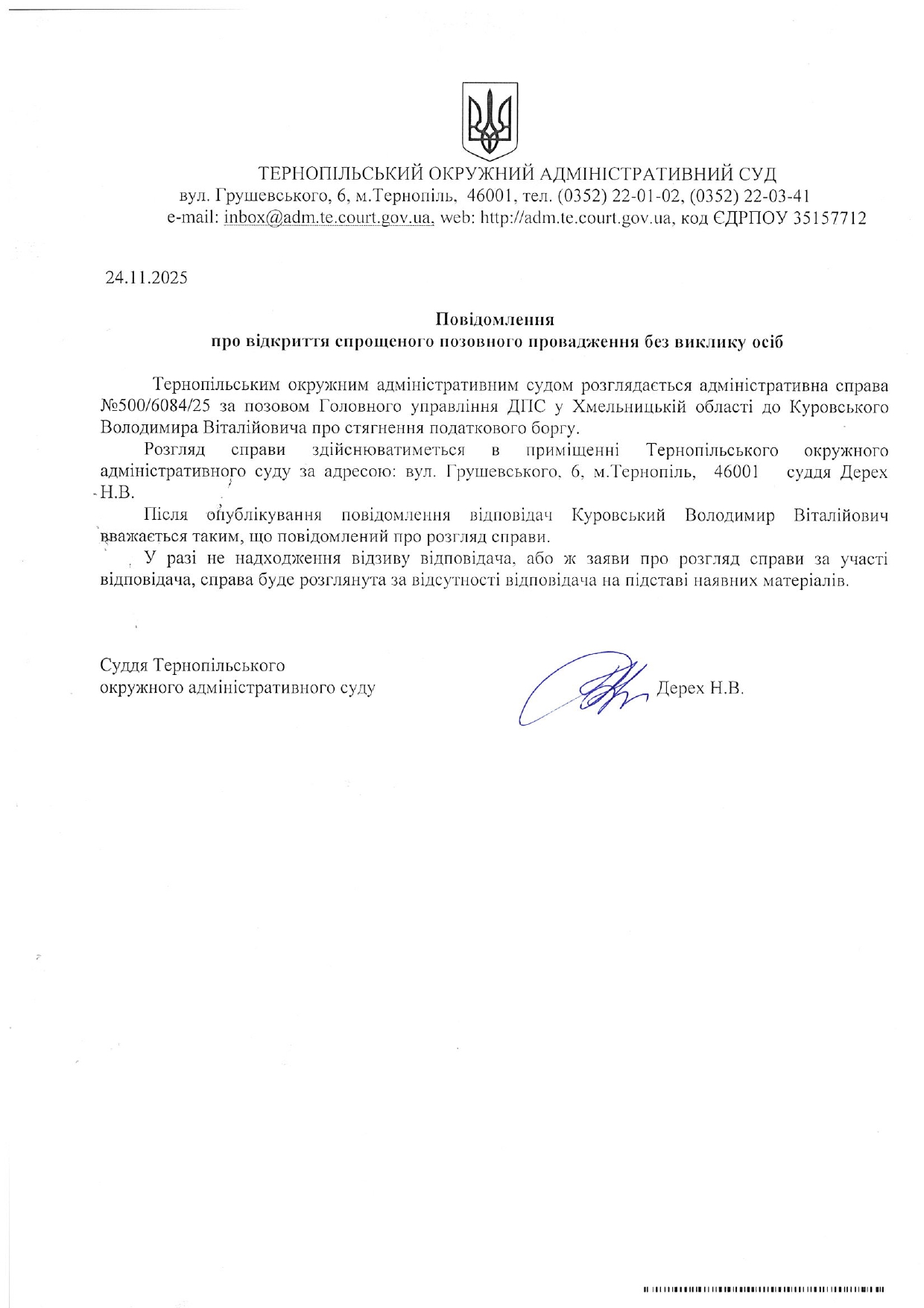 Повідомлення відповідачу Куровському Володимиру Віталійовичу у справі №500/6084/25 про відкриття спрощеного позовного провадження без виклику учасників справи