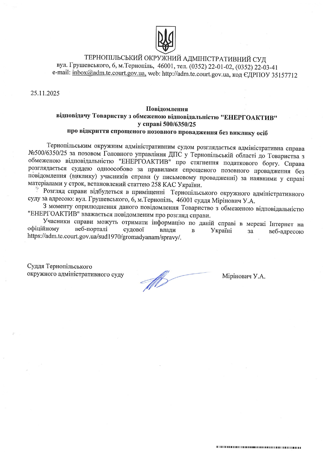 Повідомлення відповідачу Товариству з обмеженою відповідальністю “ЕНЕРГОАКТИВ” у справі №500/6350/25 про відкриття спрощеного позовного провадження без виклику учасників справи