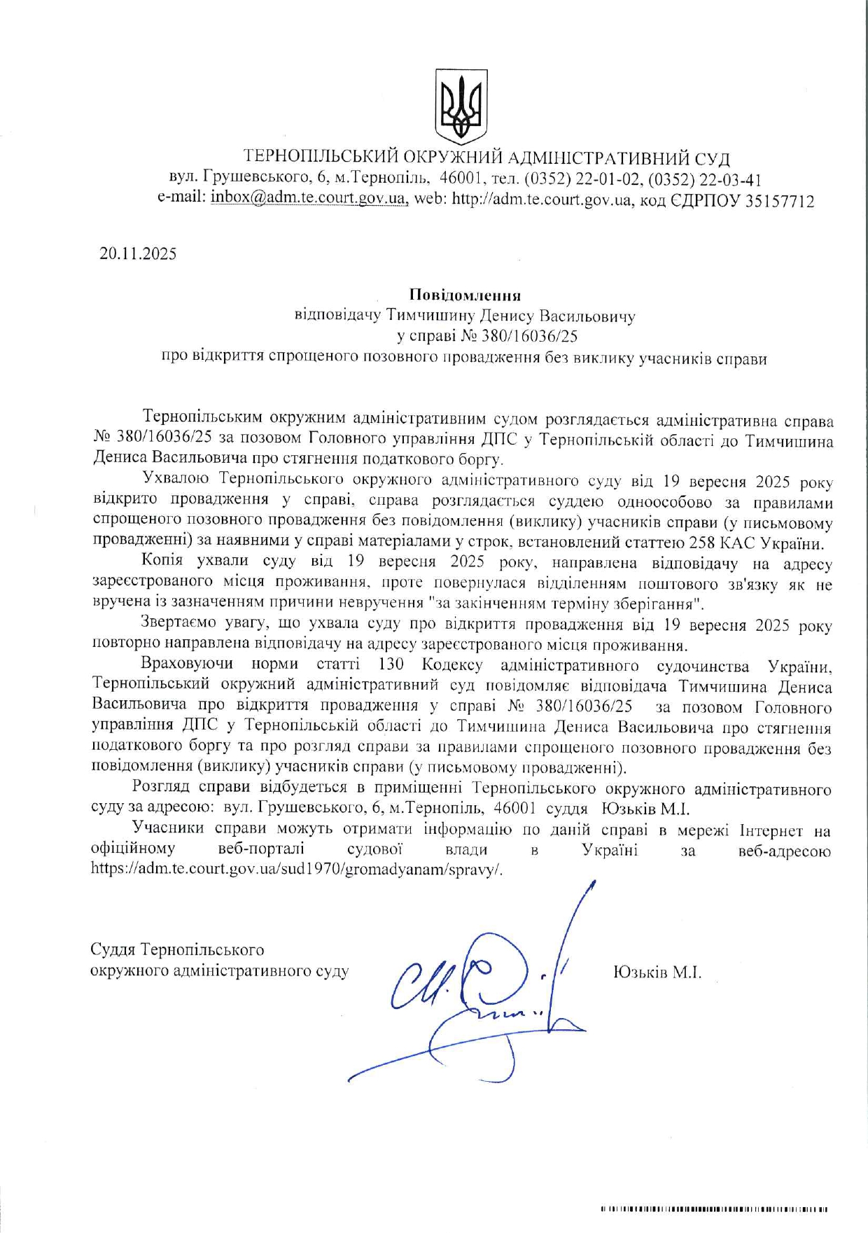 Повідомлення відповідачу Тимчишину Денису Васильовичу у справі №380/16036/25 про відкриття спрощеного позовного провадження без виклику учасників справи
