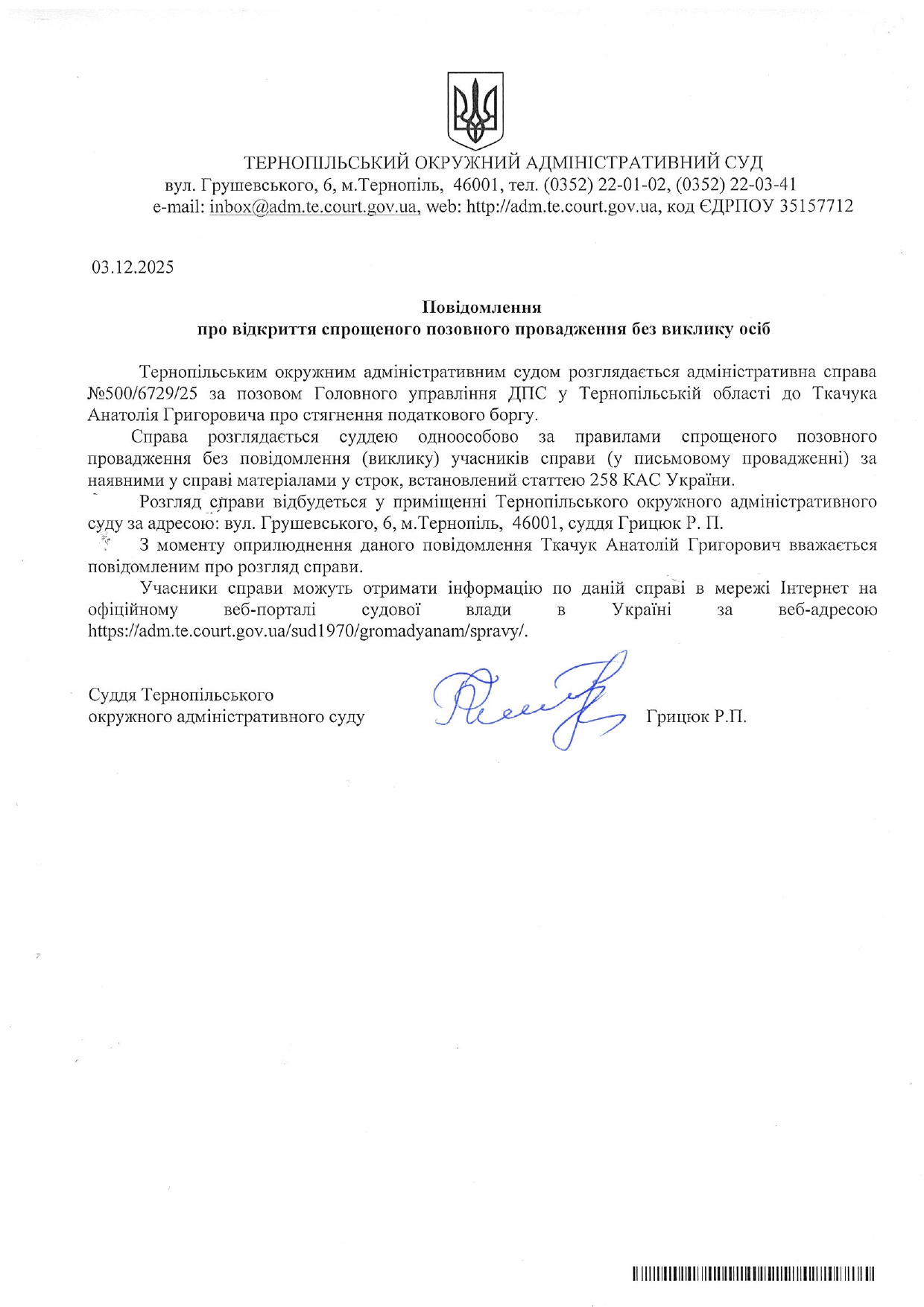 Повідомлення відповідачу Ткачуку Анатолію Григоровичу у справі №500/6729/25 про відкриття спрощеного позовного провадження без виклику учасників справи