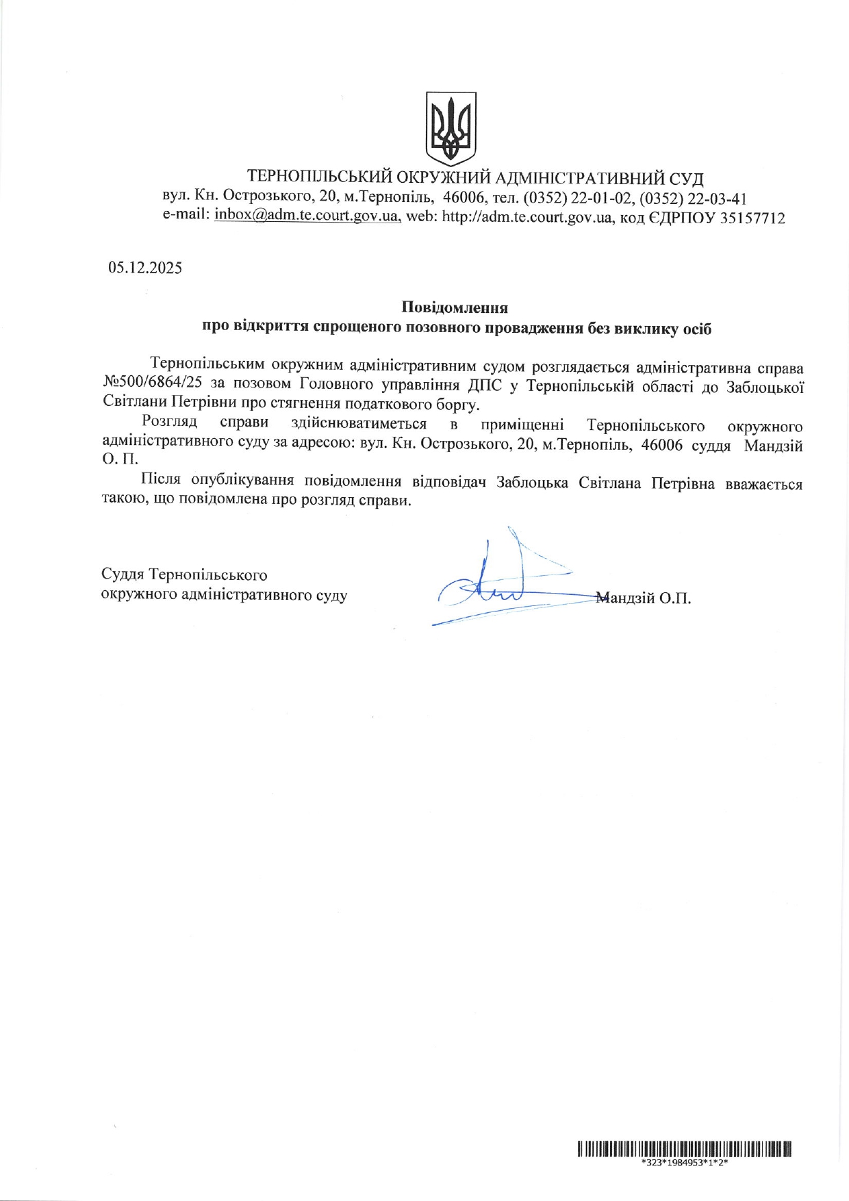 Повідомлення відповідачу Заблоцькій Світлані Петрівні у справі №500/6864/25 про відкриття спрощеного позовного провадження без виклику учасників справи