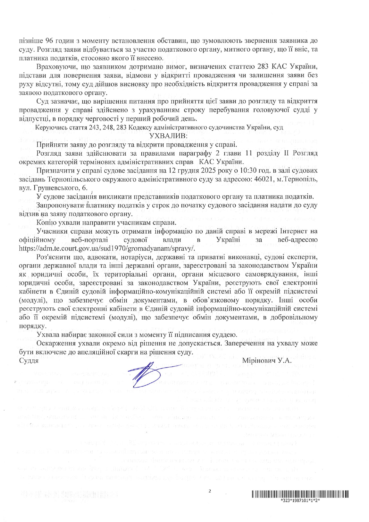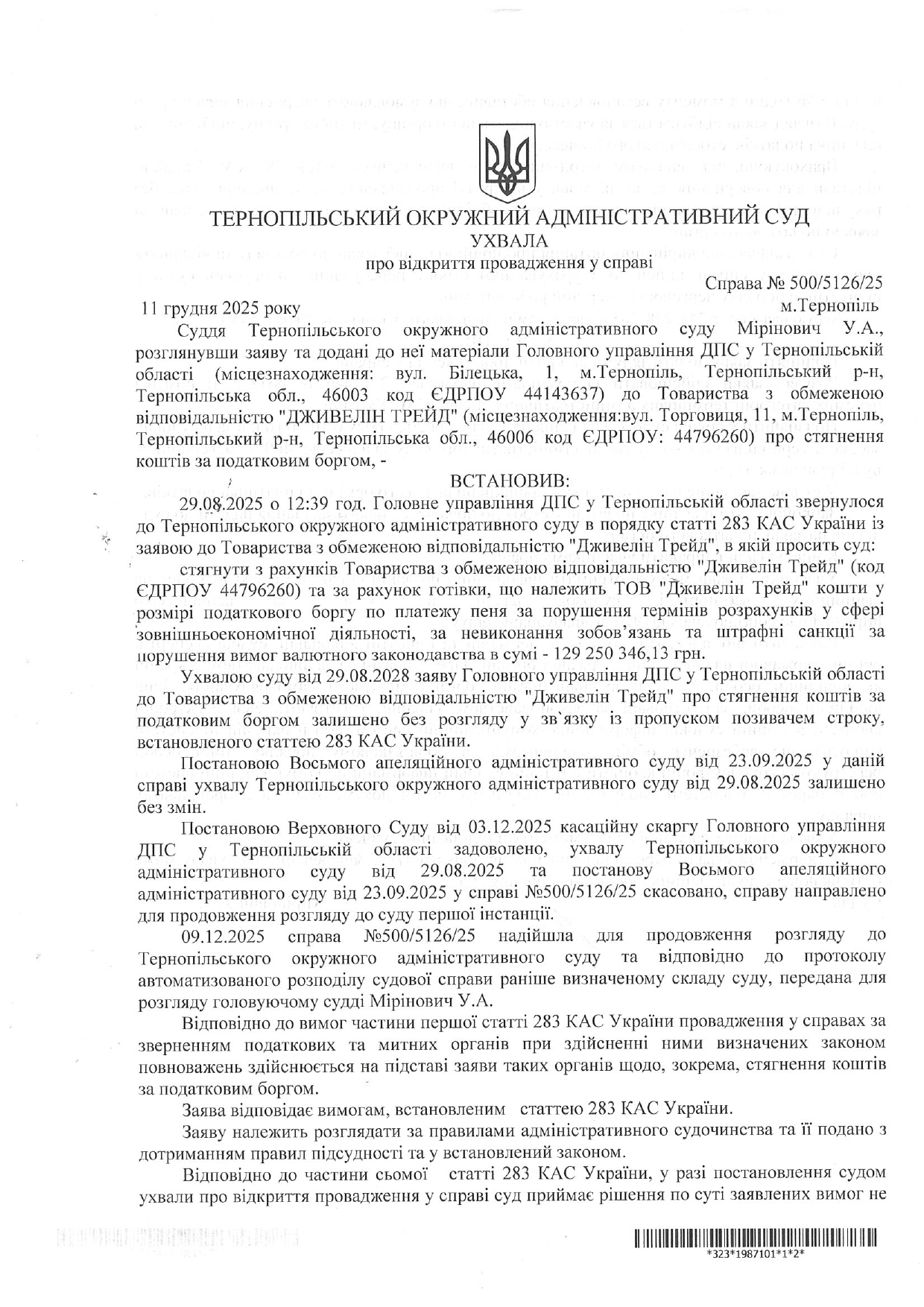 Ухвала про відкриття провадження відповідачу ТзОВ "ДЖИВЕЛІН ТРЕЙД" у справі №500/5126/25