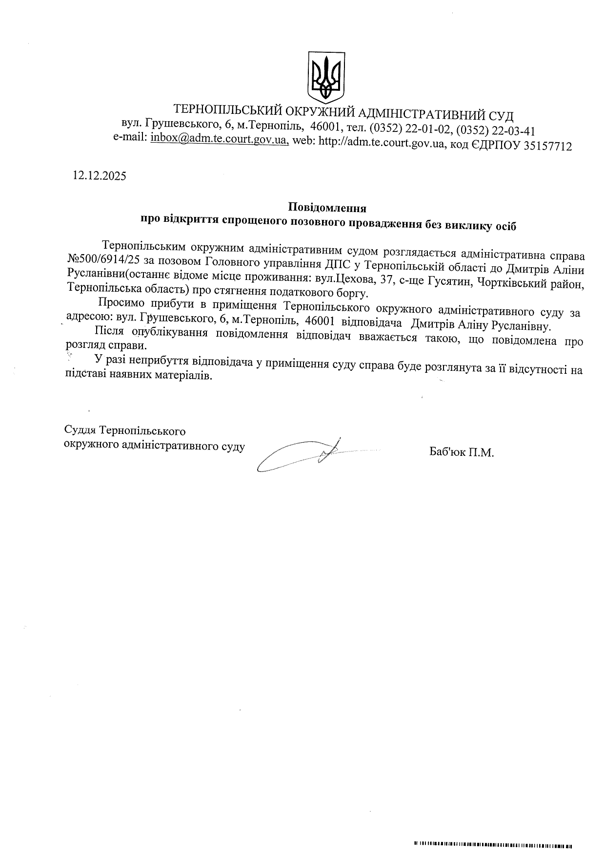 Повідомлення відповідачу Дмитрів Аліні Русланівні у справі №500/6914/25 про відкриття спрощеного позовного провадження без виклику учасників справи
