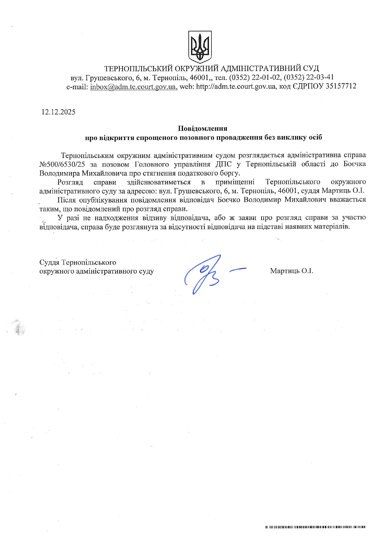 Повідомлення відповідачу Боєчку Володимиру Михайловичу у справі №500/6530/25 про відкриття спрощеного позовного провадження без виклику учасників справи