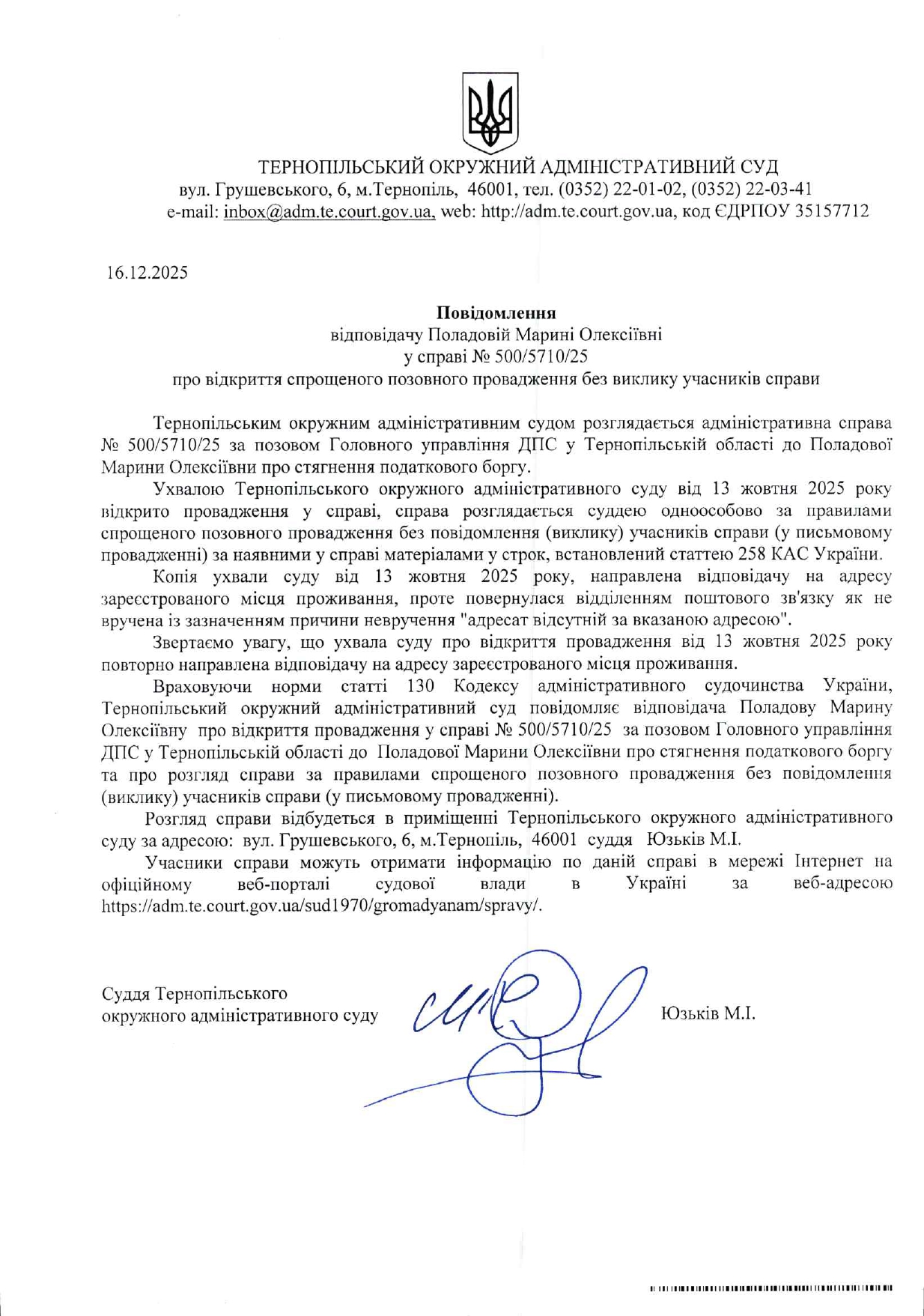 Повідомлення відповідачу Поладовій Марині Олексіївні у справі №500/5710/25 про відкриття спрощеного позовного провадження без виклику учасників справи