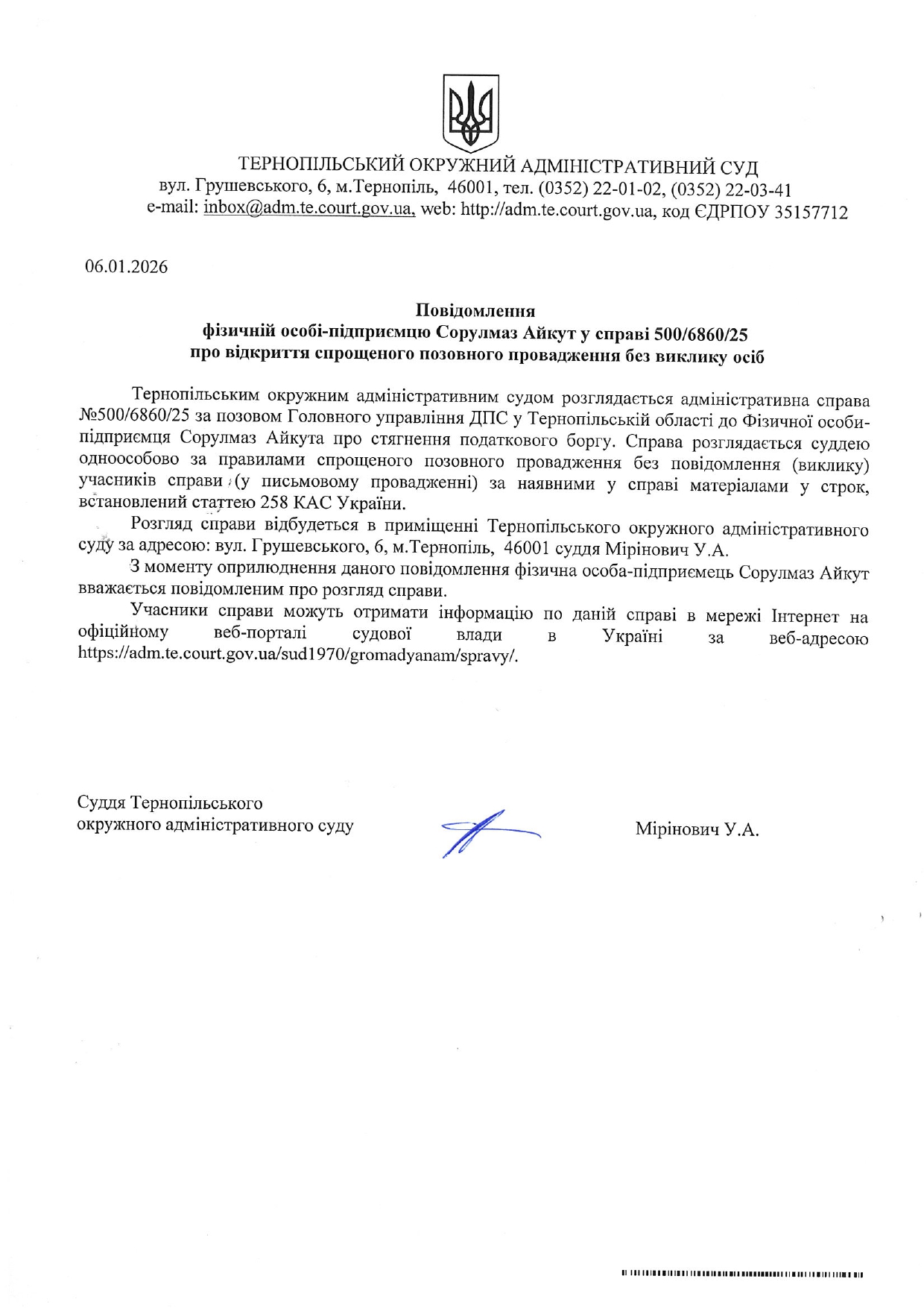 Повідомлення відповідачу фізичній особі-підприємцю Сорулмаз Айкут у справі №500/6860/25 про відкриття спрощеного позовного провадження без виклику учасників справи