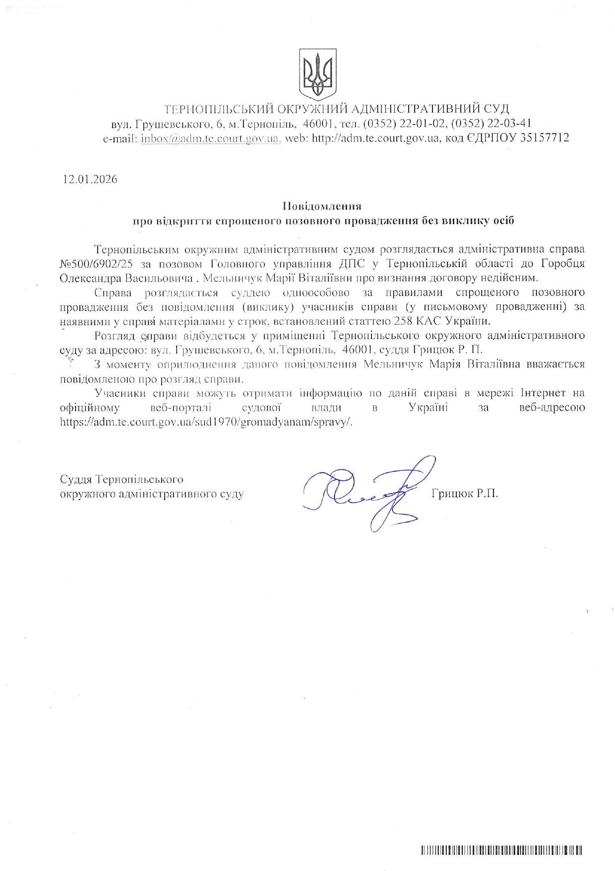 Повідомлення відповідачу Мельничук Марії Віталіївні у справі №500/6902/25 про відкриття спрощеного позовного провадження без виклику учасників справи