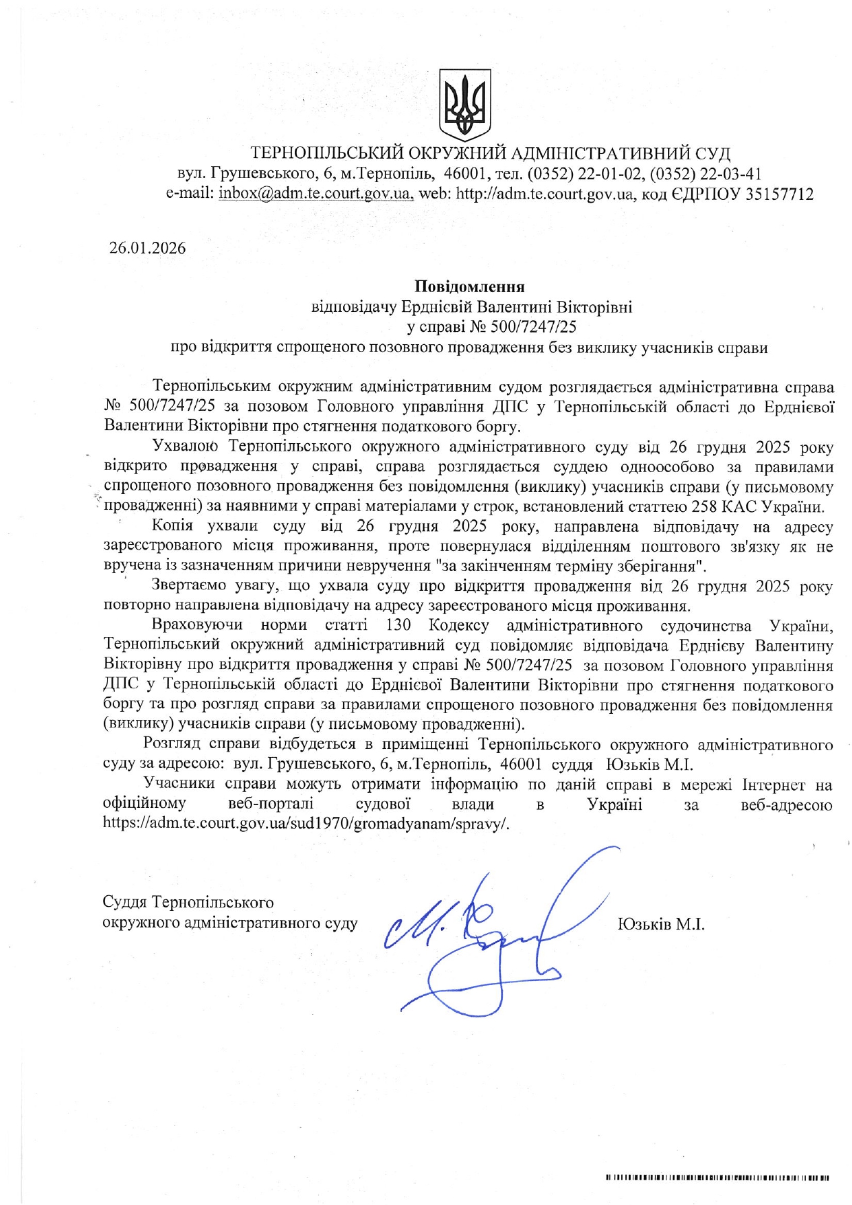 Повідомлення відповідачу Ерднієвій Валентині Вікторівні у справі №500/7247/25 про відкриття спрощеного позовного провадження без виклику учасників справи