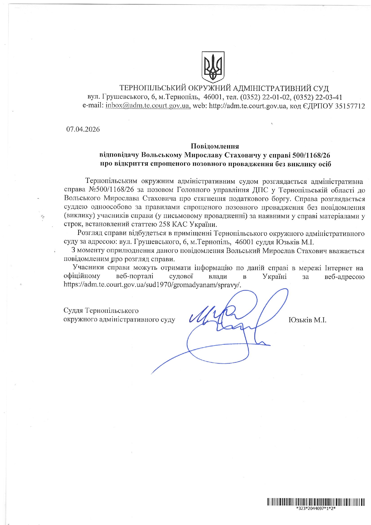 Повідомлення відповідачу Вольському Мирославу Стаховичу у справі №500/1168/26 про відкриття спрощеного позовного провадження без виклику учасників справи