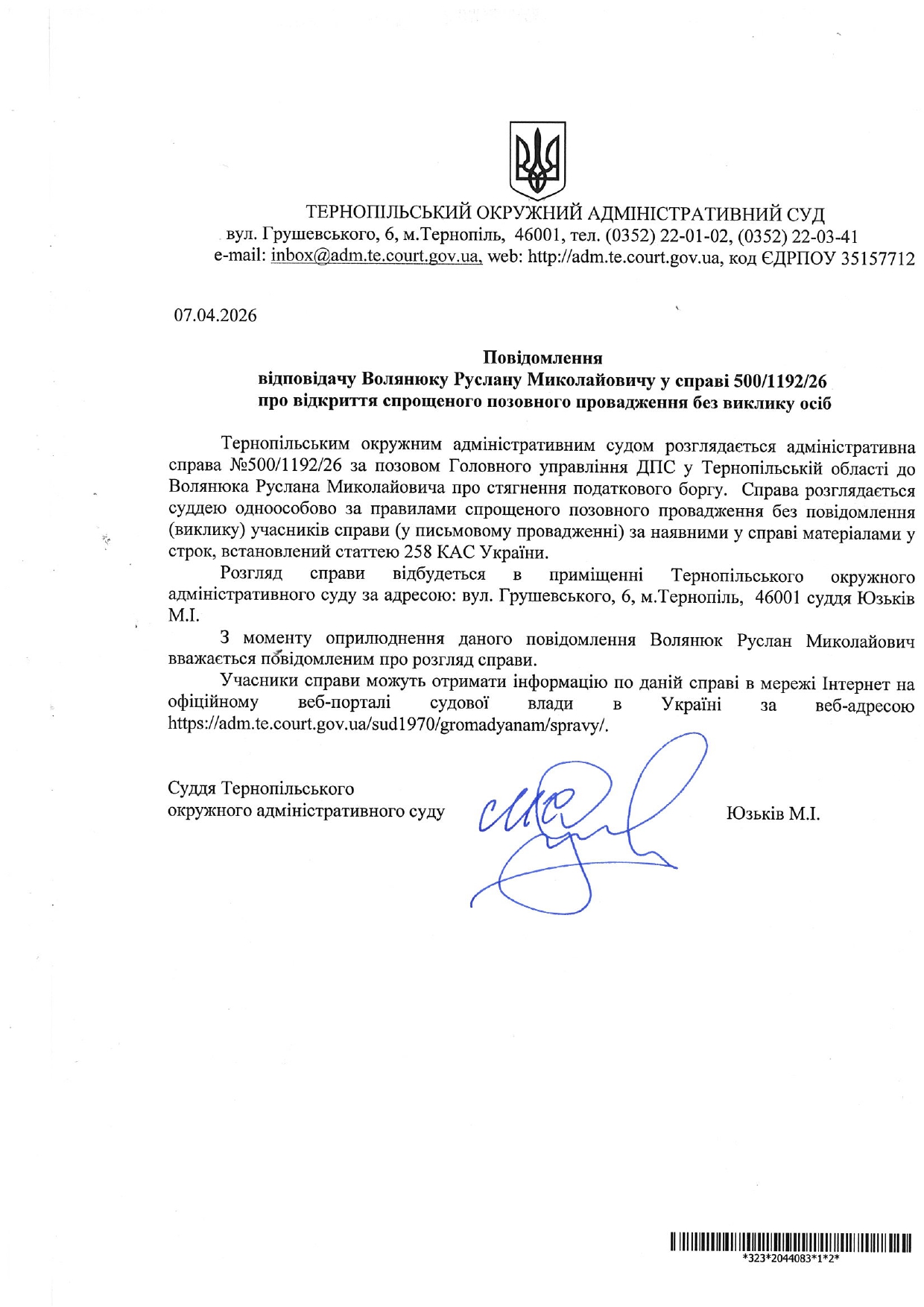 Повідомлення відповідачу Волянюку Руслану Миколайовичу у справі №500/1192/26 про відкриття спрощеного позовного провадження без виклику учасників справи