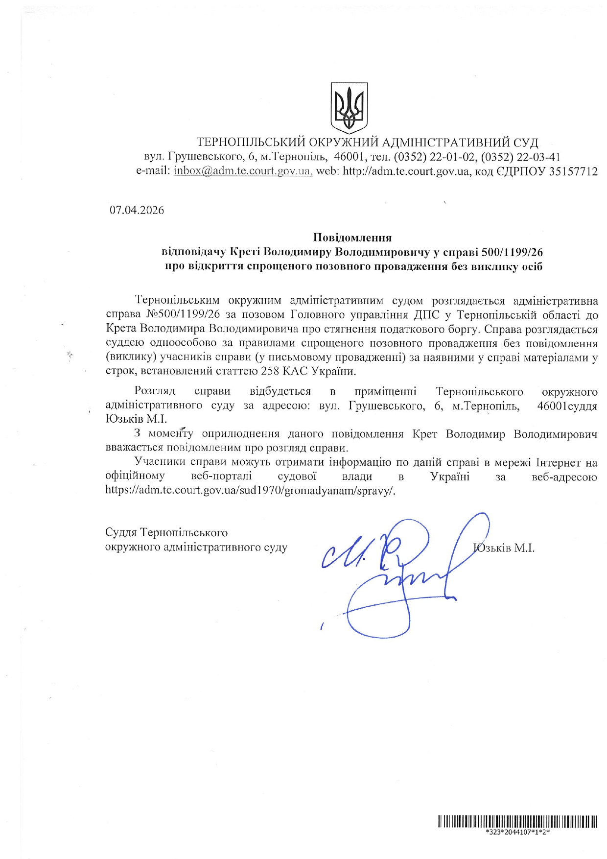 Повідомлення відповідачу Креті Володимиру Володимировичу у справі №500/1199/26 про відкриття спрощеного позовного провадження без виклику учасників справи