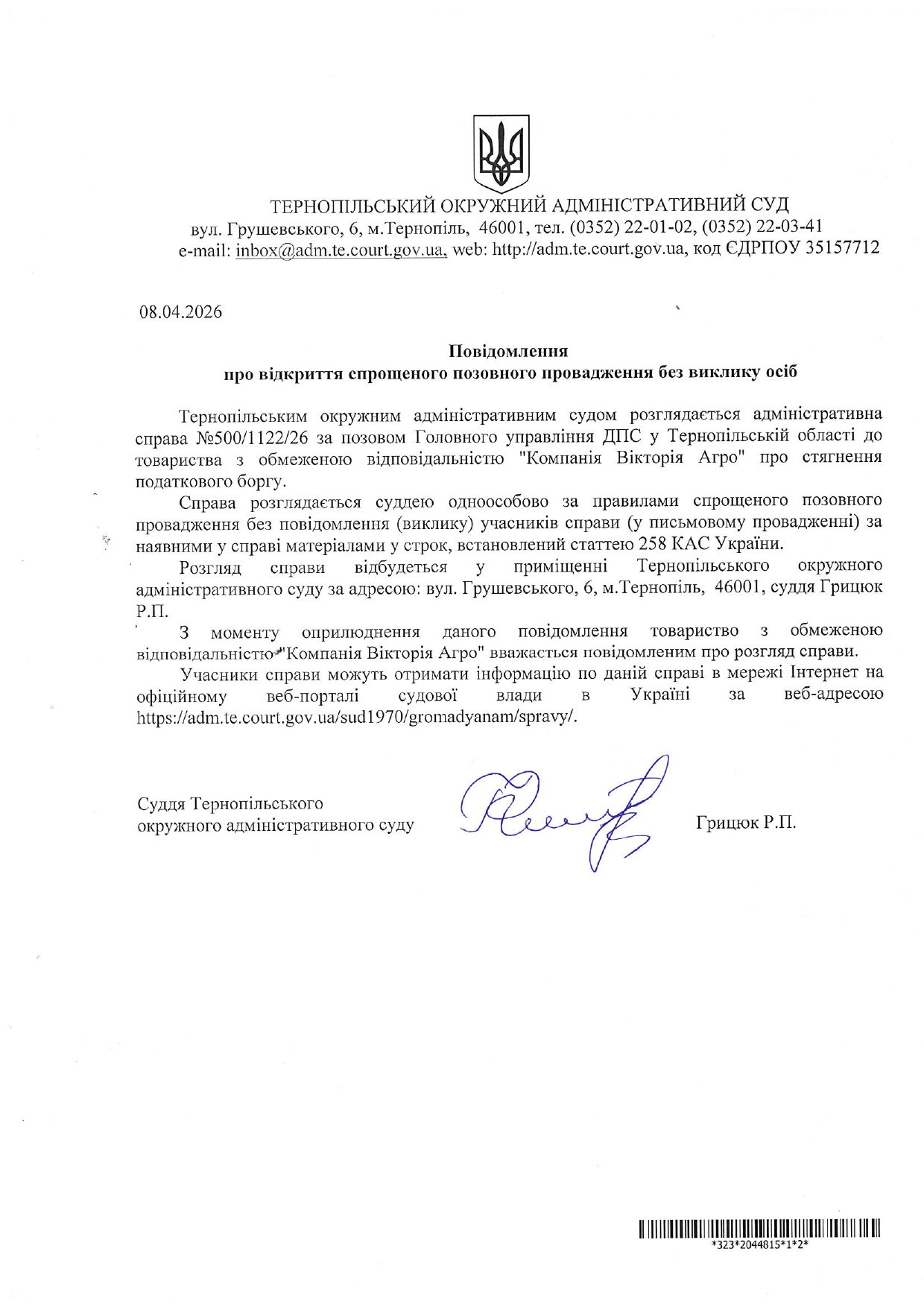 Повідомлення відповідачу Товариству з обмеженою відповідальністю "Компанія Вікторія Агро" у справі №500/1122/26 про відкриття спрощеного позовного провадження без виклику учасників справи