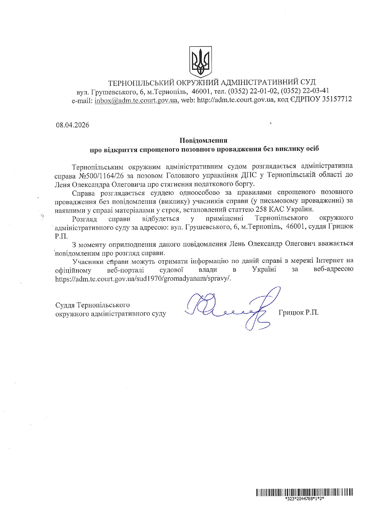 Повідомлення відповідачу Леню Олександру Олеговичу у справі №500/1164/26 про відкриття спрощеного позовного провадження без виклику учасників справи