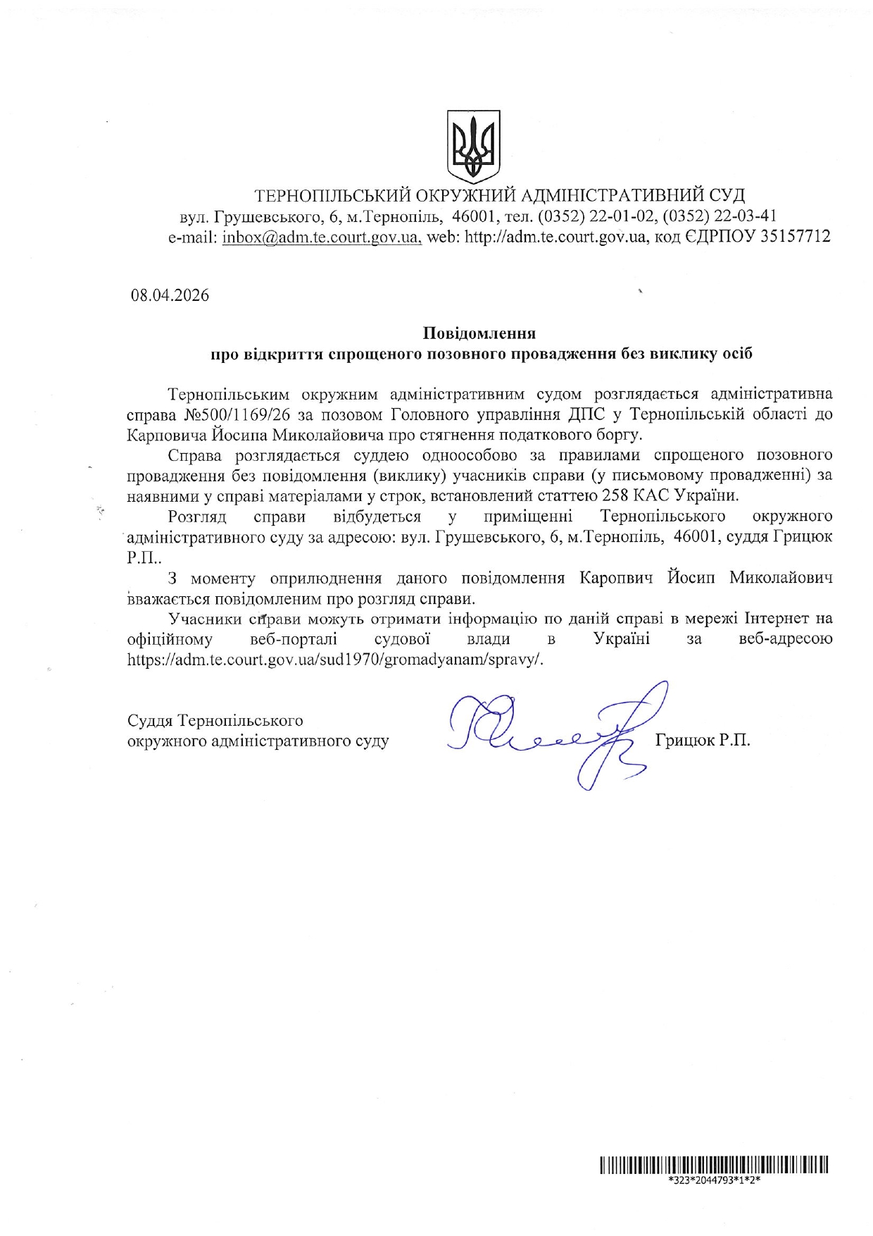 Повідомлення відповідачу Карповичу Йосипу Миколайовичу у справі №500/1169/26 про відкриття спрощеного позовного провадження без виклику учасників справи