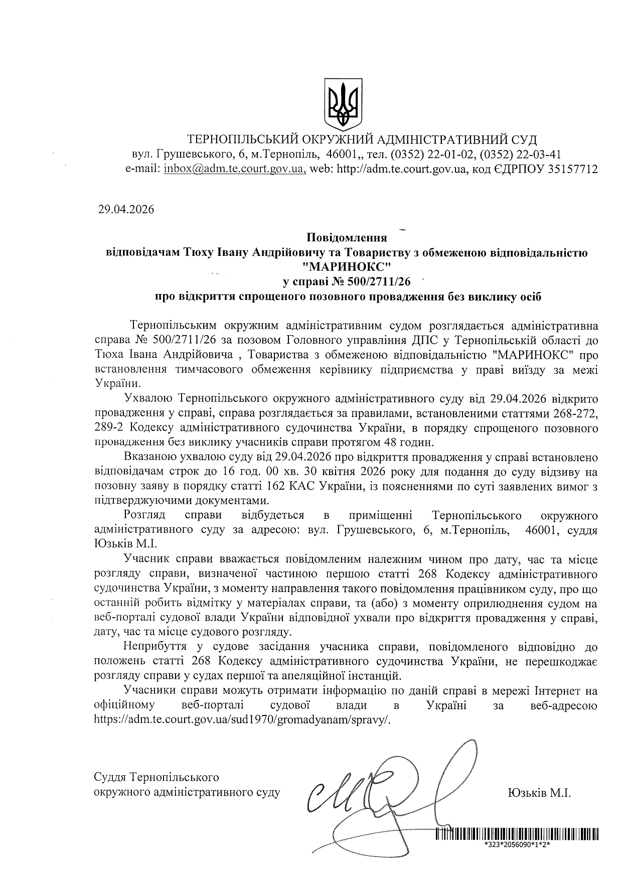 Повідомлення відповідачам Тюху Івану Андрійовичу та Товариству з обмеженою відповідальністю "МАРИНОКС" у справі №500/2711/26 про відкриття спрощеного позовного провадження без виклику учасників справи