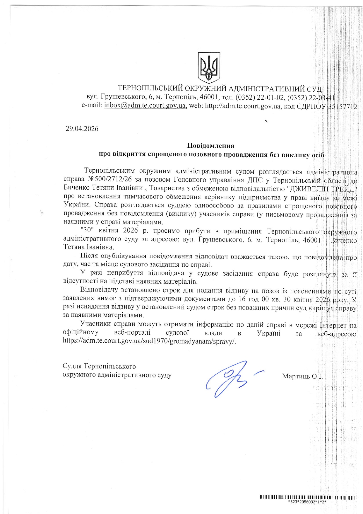 Повідомлення відповідачам Биченко Тетяни Іванівни та Товариству з обмеженою відповідальністю "ДЖИВЕЛІН ТРЕЙД" у справі №500/2712/26 про відкриття спрощеного позовного провадження без виклику учасників справи